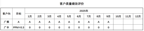 客戶認可、品質背書:內部管理的精進,最終體現在客戶端的評價上。廣州宏昌2025年面對廣汽傳祺、埃安、豐田等主要客戶,持續獲得最高等級“A”的評價,這正是“異常單大使”推動的閉環管理、保障出貨產品品質穩定提升的最有力證明。